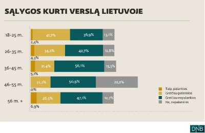 Tokią pat tendenciją atskleidžia ir kitas – DNB banko užsakymu bendrovės „Spinter tyrimai“ atliktas – Lietuvos gyventojų verslumo tyrimas. Jame nustatyta, kad 18-25 amžiaus jaunuoliai sąlygas Lietuvoje kurti verslą vertina palankiai arba greičiau palankiai. Šį atsakymą pasirinko per 44 proc. minėto amžiaus respondentų. O apklausoje dalyvavę 46-55 m. amžiaus žmonės verslo sąlygas šalyje palankiai vertina tik 24 proc. Panašu, kad su metais optimizmas blėsta.
