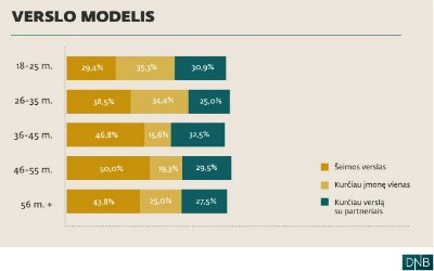 Taip pat matoma dar viena ryški tendencija – kuo jaunesnis žmogus, tuo labiau nori kurti įmonę vienas. Norą kurti verslą individualiai išreiškė 35,3 proc. 18-25 m. respondentų. Tuo tarpu vyresni vis labiau linksta prie šeimyninio verslo modelio, o labiausiai tokį verslą norėtų kurti 46-55 m. sulaukę respondentai – net 50 proc., teigiama DNB banko pranešime.