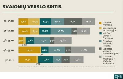 DNB banko užsakyto tyrimo metu išsiaiškinta, kad 18-25 m. apklausos dalyviai savo verslą labiausiai kurti norėtų Sveikatos apsaugos srityje (16,2 proc.). Antrąja vieta šioje amžiaus grupėje dalinasi turizmas ir prekyba (11,8 proc.), o trečioje vietoje atsidūrė IT ir kultūros sritys (10,3 proc.). Mažiausiai šios amžiaus grupės respondentai norėtų imtis verslo gamybos srityje (8,8 proc.).
